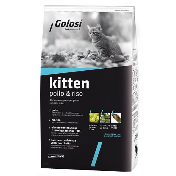 GolosiPollo Riso Tavuk ve Pirinçli Yavru Kedi Maması yüksek protein ve dengeli yağar ile tam bir besin deposudur. Deri ve tüy sağlığı için dengeli oranda omega 3 ve omega 6 yağ asitleri içermektedir. İlave olarak koruyucu veya kedinizin sindirimini zorlaştıracak katkı maddesi bulunmamaktadır. GolosiPollo Riso Tavuk ve Pirinçli Yavru Kedi Maması içindekiler şu şekildedir: